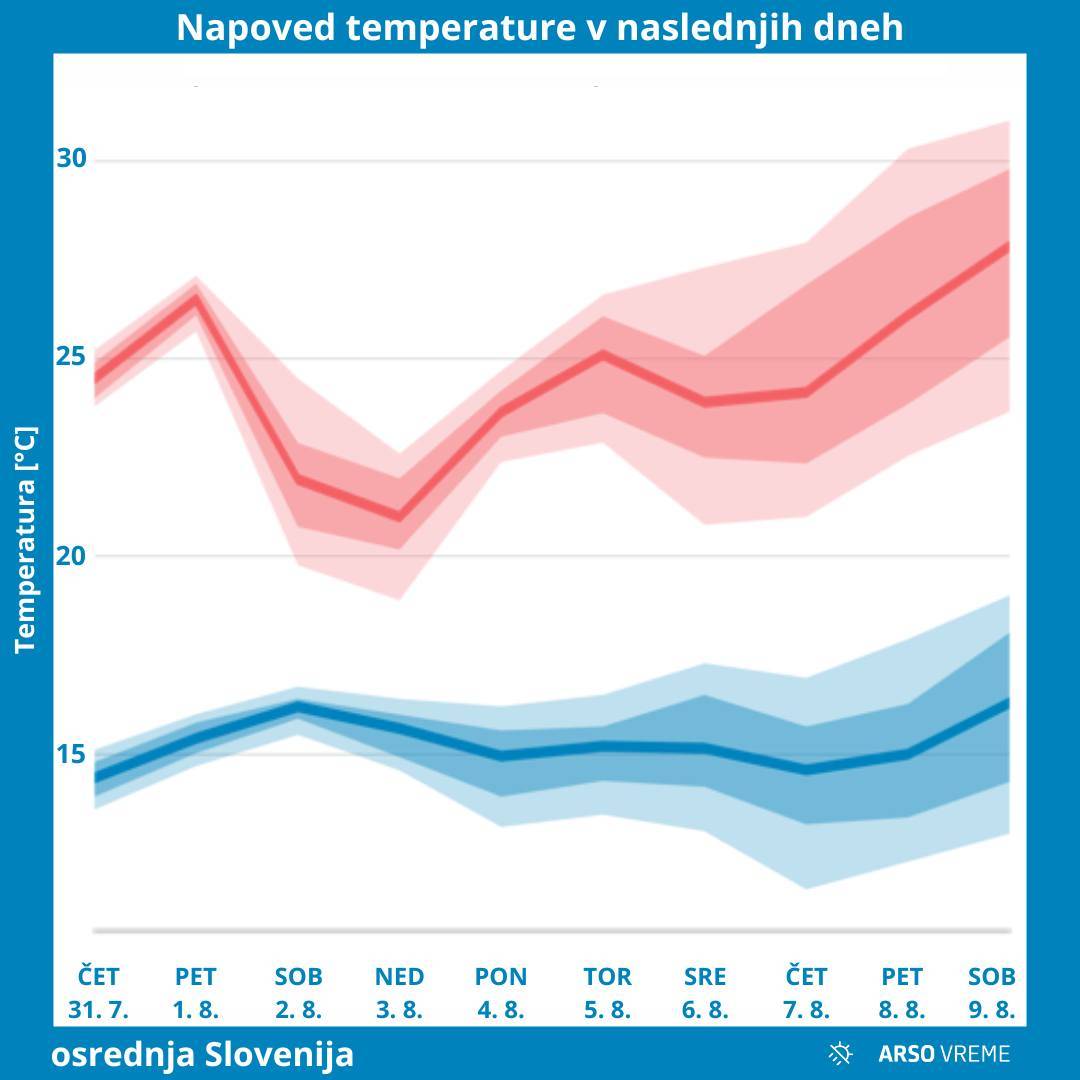 Vreme se bo počasi ustalilo v drugi polovici tedna, temperature pa se bodo ob koncu tedna vendarle vse bolj približale 30 stopinj Celzija.