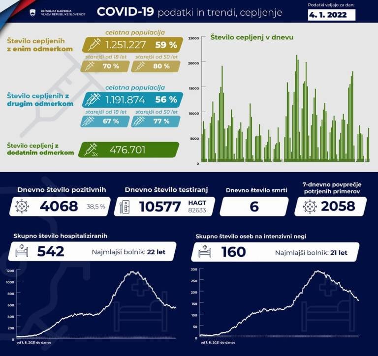 V Sloveniji so včeraj, 4. januarja, opravili 10.577 PCR testiranj na koronavirus in potrdili 4068 novih okužb, gre za 38,5-odstotni delež okužb.