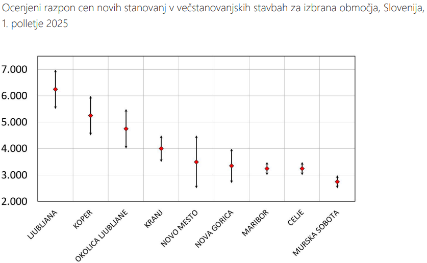Najvišje cene so še naprej v Ljubljani, kjer so se nova stanovanja prodajala po 5500 do 7000 evrov na kvadratni meter, v Kopru med 4500 in 6000 evrov, v Kranju med 3500 in 4500 evrov, ter v Mariboru in Celju med 3000 in 3500 evrov.