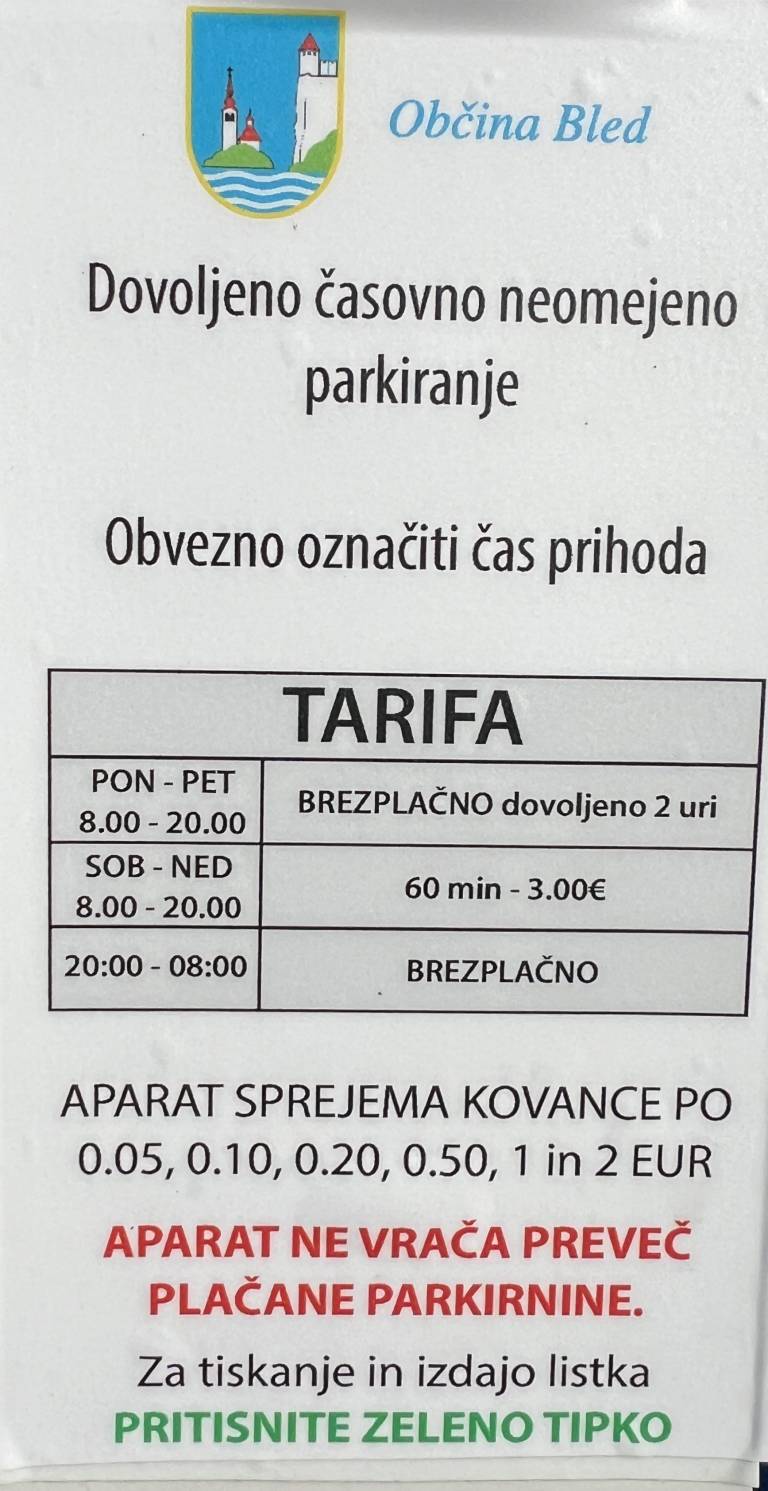 Izven sezone je tako ob sobotah in nedeljah za uro parkiranja treba plačati tri evre (do pred kratkim dva), s tem da aparat ne vrača preveč plačane parkirnine. Med tednom sta do dve uri parkiranja zastonj, v času sezone je parkiranje plačljivo vse dni v tednu.