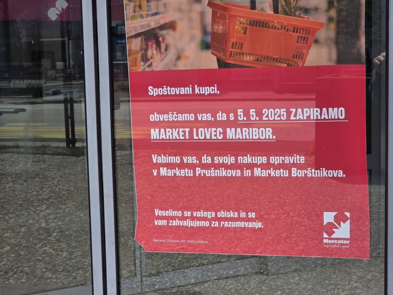 Na zaprtih vratih trgovine na Radvanjski cesti v Mariboru piše, da so kupci vabljeni v sosednji Mercatorjevi trgovini.