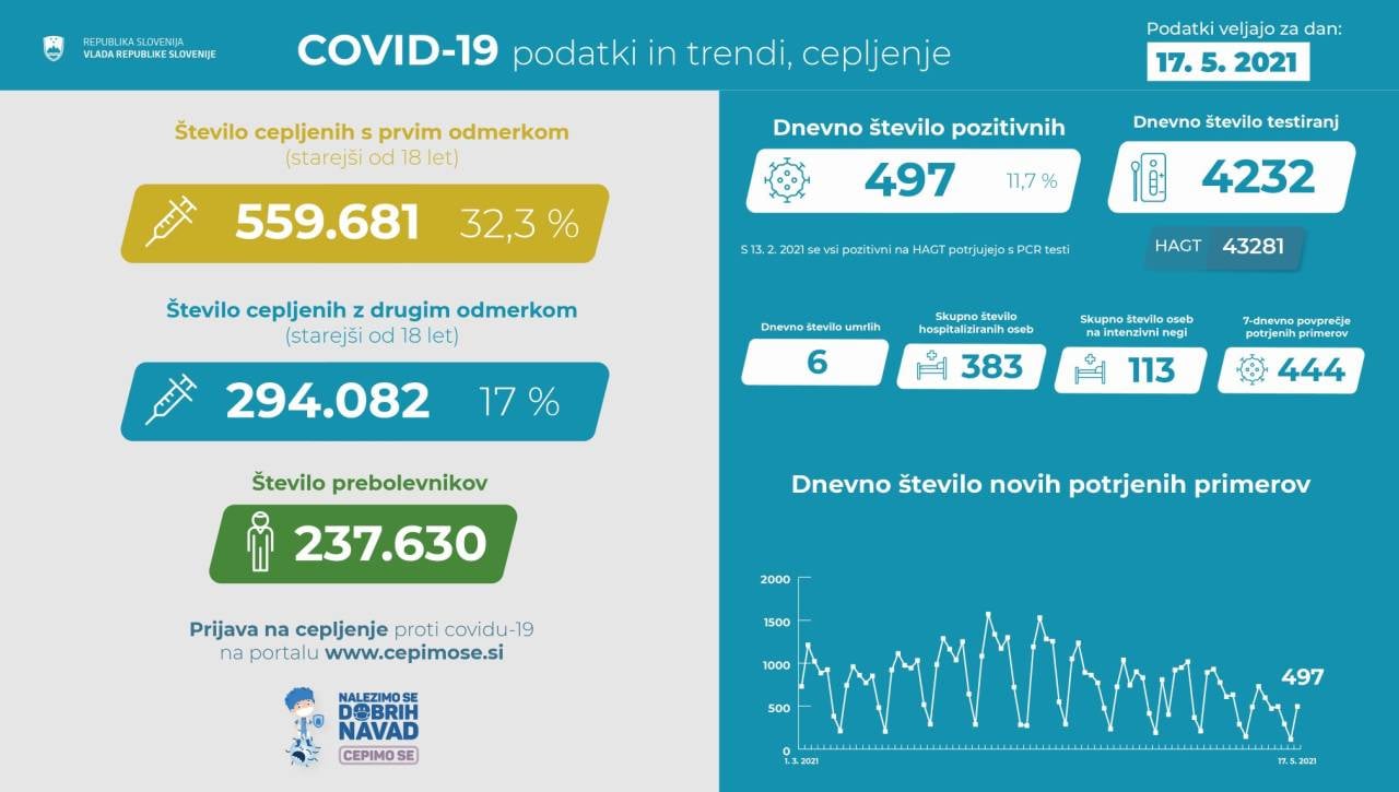 V Sloveniji so včeraj, 17. maja, opravili 4232 PCR testiranj na koronavirus in potrdili 497 novih okužb, gre za 11,7-odstotni delež okužb. Aktivnih okužb s koronavirusom je trenutno v Sloveniji 7071.