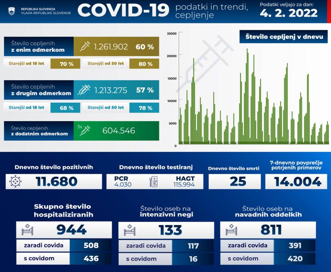 V Sloveniji so včeraj, 4. februarja, opravili 4030 PCR in 115.994 hitrih antigenskih testiranj na koronavirus in pri tem potrdili 11.680 novih okužb.