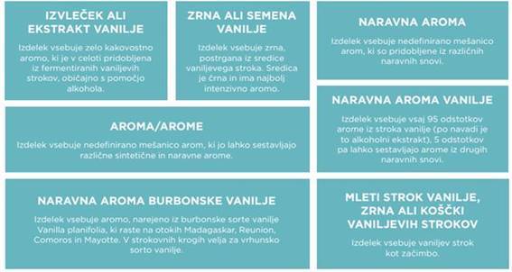 Tisti, ki imajo na njej upodobljen cvet ali strok vanilje, morajo imeti dodano vsaj naravno aromo vanilje.