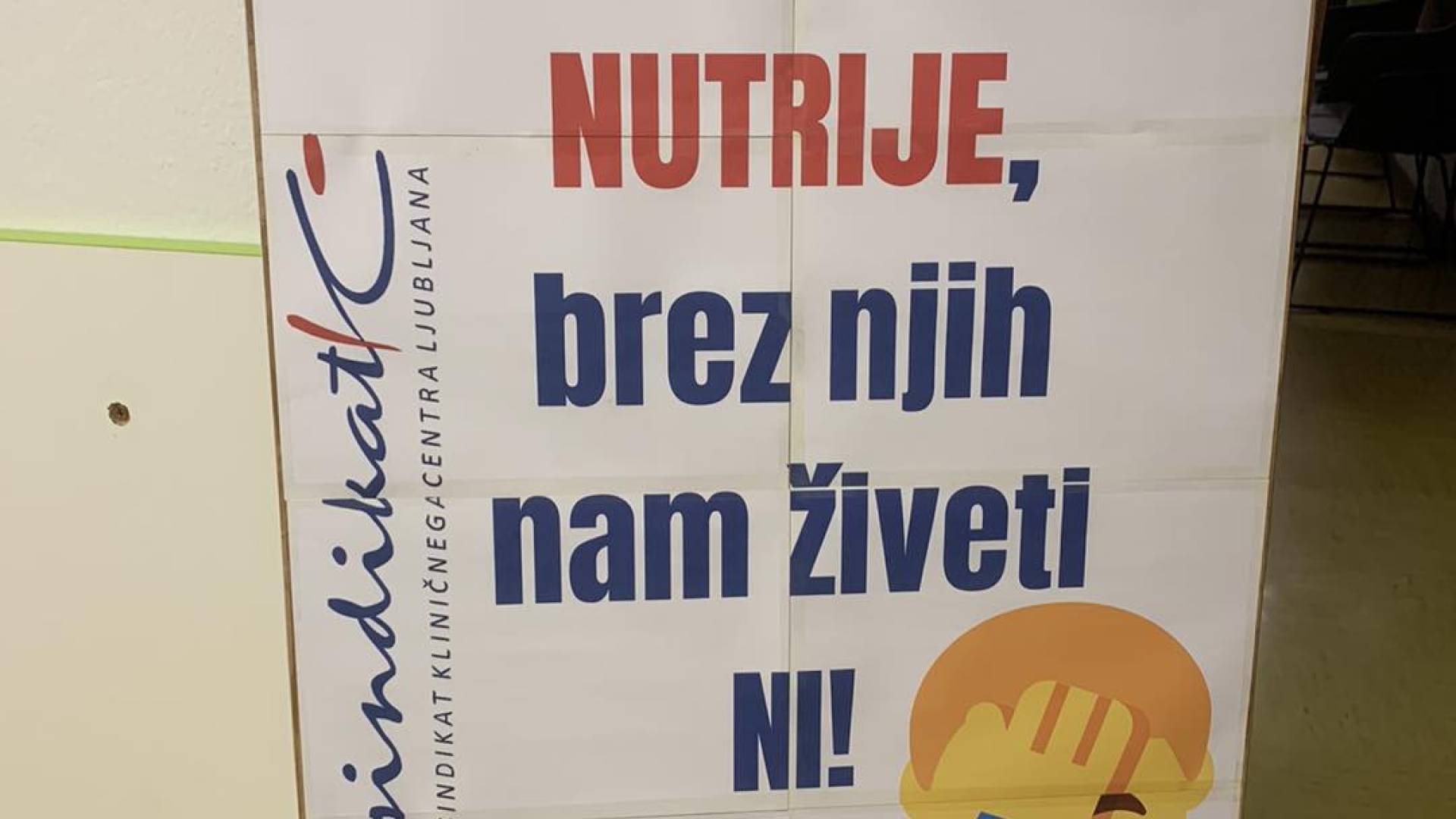 Sindikat Kliničnega centra Ljubljana je protest napovedal tudi s panojem, na katerem piše: »Varujmo nutrije, brez njih nam živeti ni!«