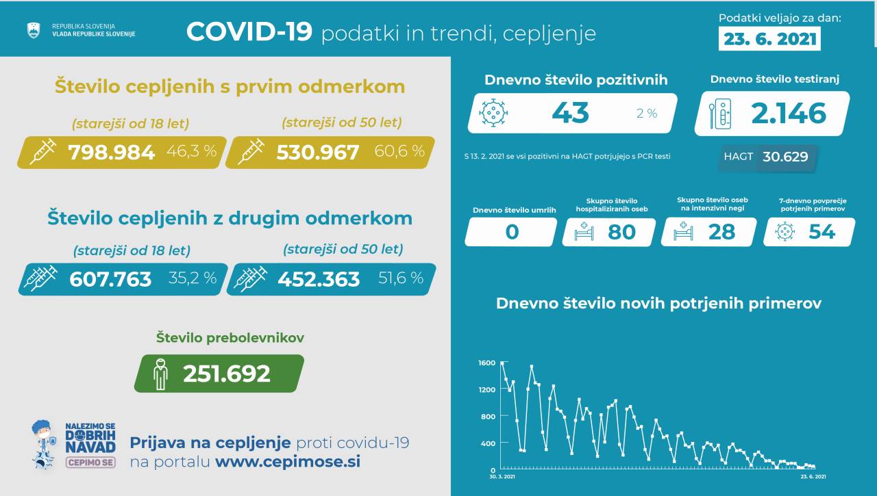 V Sloveniji so včeraj, 22. junija, opravili 2146 PCR testiranj na koronavirus in potrdili 43 novih okužb, gre za 2-odstotni delež okužb.