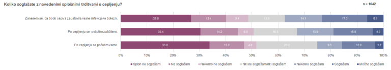 Tri trditve v sklopu opisujejo pozitivne učinke cepljenja, zato so prikazane ločeno. V primerjavi z negativnimi učinki so stopnje strinjanja tu nizke.
