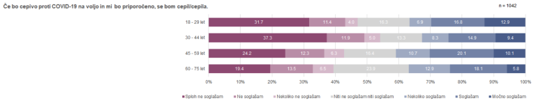 Spodnja slika prikazuje odstotke soglašanja po starostnih kategorijah: pripravljenost za cepljenje je najnižja pri starostni skupini od 30 do 44 let. Pri interpretaciji rezultatov za starostno skupino 60–75 let je treba upoštevati, da je pri tej skupini višji delež že cepljenih in ti niso sodelovali v anketi.