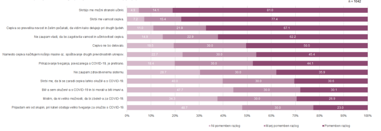 Čeprav je tri četrtine vprašanih vsaj nekoliko zaskrbljenih zaradi virusa, skoraj polovica vprašanih trenutno izraža večjo ali manjšo nepripravljenost za cepljenje, če jim bo to ponujeno in priporočeno. Med razlogi za zadržanost do cepljenja prevladujeta strah pred morebitnimi stranskimi učinki in zaskrbljenost zaradi varnosti cepiva.