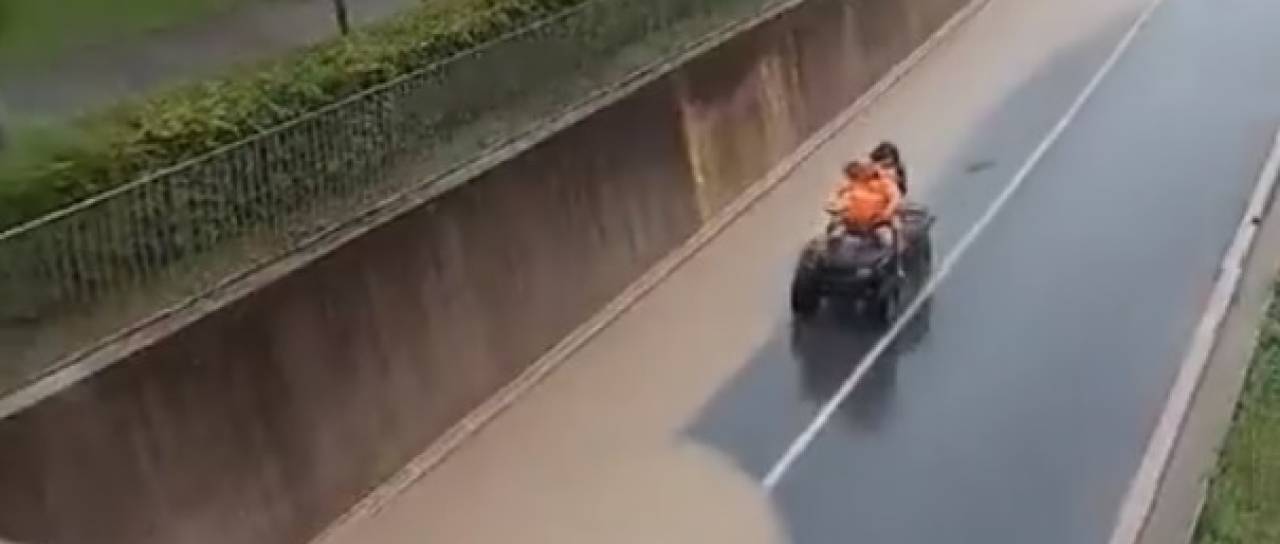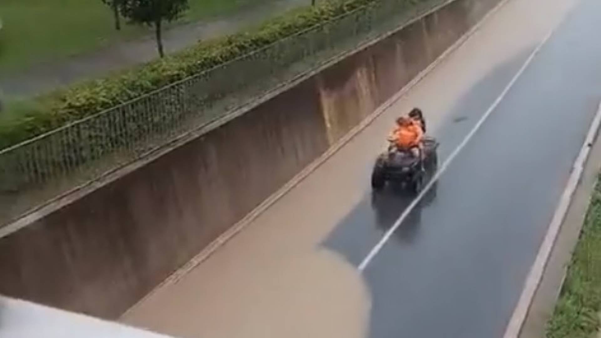 Dvojec se je na štirikolesniku pogumno podal v mrke vode poplavljenega podvoza tik ob deroči Savinji, a klavrno končal z vsemi štirimi v zrak.