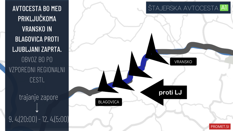 Ta konec tedna, od danes, 9. aprila, in sicer od 20. ure, pa vse do ponedeljka, 12. aprila, in sicer do 5. ure zjutraj, bo zaradi rednih vzdrževalnih del zaprta štajerska avtocesta med priključkoma Vransko in Blagovica proti Ljubljani. Promet bo v tem času preusmerjen na vzporedno regionalno cesto.