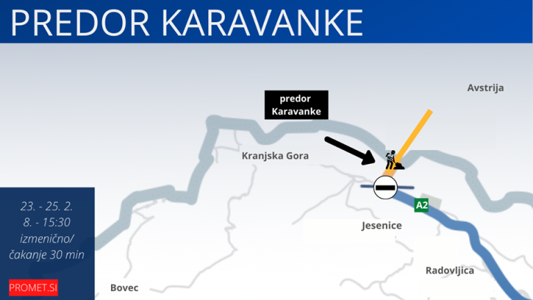 Zaradi vzdrževalnih del na avstrijski strani bo promet skozi predor Karavanke v torek, 23., sredo, 24., in četrtek, 25. februarja, med 8. in 15.30 uro urejen izmenično enosmerno. Predviden čas čakanja pred predorom na prosto smer vožnje je 30 minut.