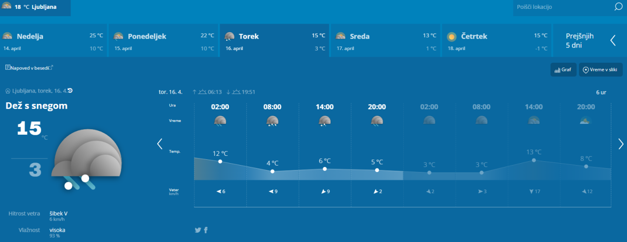 »Po torkovem prehodu fronte, ki bi nam lahko prinesel tudi kar obilne padavine in nizko mejo sneženja, bodo sledila precej hladna jutra, a zaenkrat ne kaže, da bo udarila pozeba, popoldanske temperature pa se bodo v prihodnjem tednu gibale okoli 15 stopinj Celzija, kar pa je v bistvu zelo blizu povprečja za ta čas,« zaključuje meteorolog Rok Nosan.