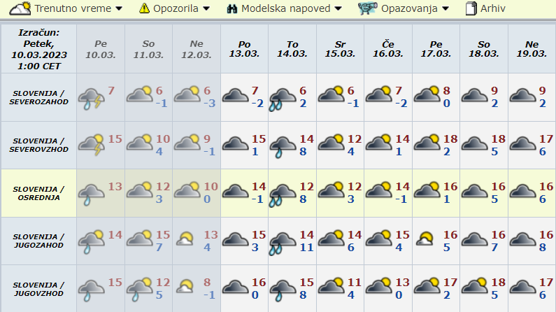 »V marcu in aprilu bomo deležni kar nekaj hladnih prodorov, saj je na severu še kar konkretna zaloga hladnega zraka. Skrajni rob te hladne doline nas bo s pomočjo vetra severnih smeri dosegel v nedeljo, ko bodo jutranje temperature ponekod pod ničlo, ampak le za kratek čas. Nove padavine si ob prehodu fronte lahko obetamo šele v torek, nato pa sledi krepitev anticiklona.