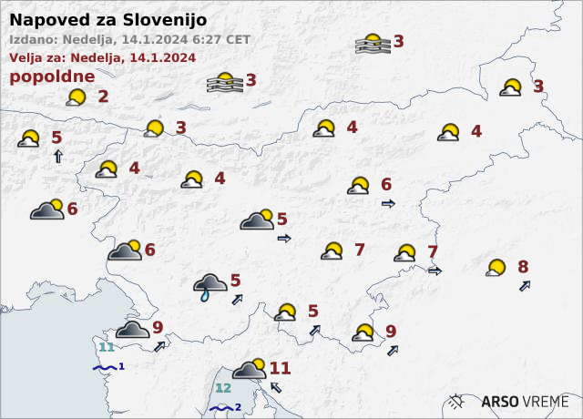 Ponekod bo pihal jugozahodni veter. Najvišje dnevne temperature bodo od tri do devet stopinj Celzija.