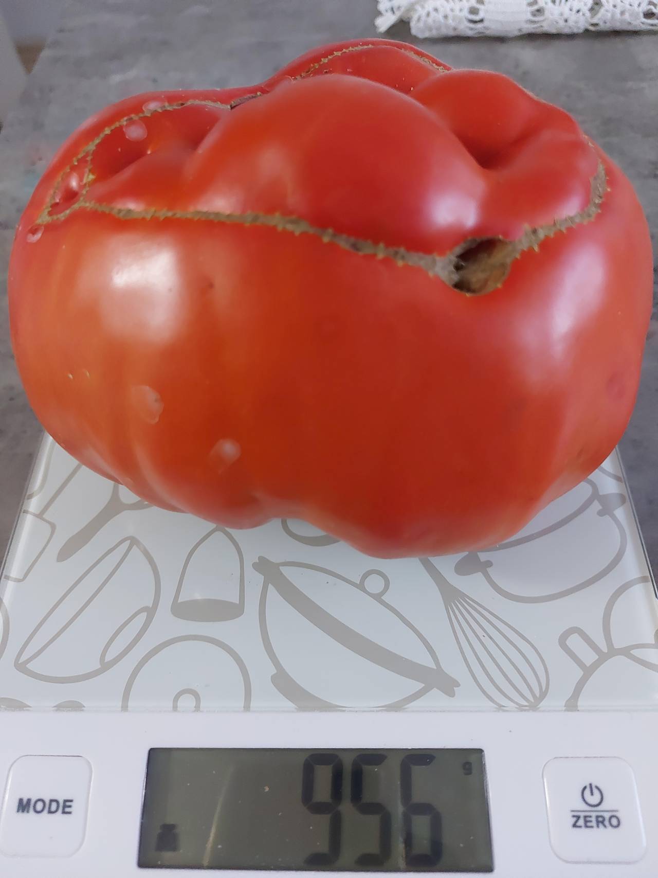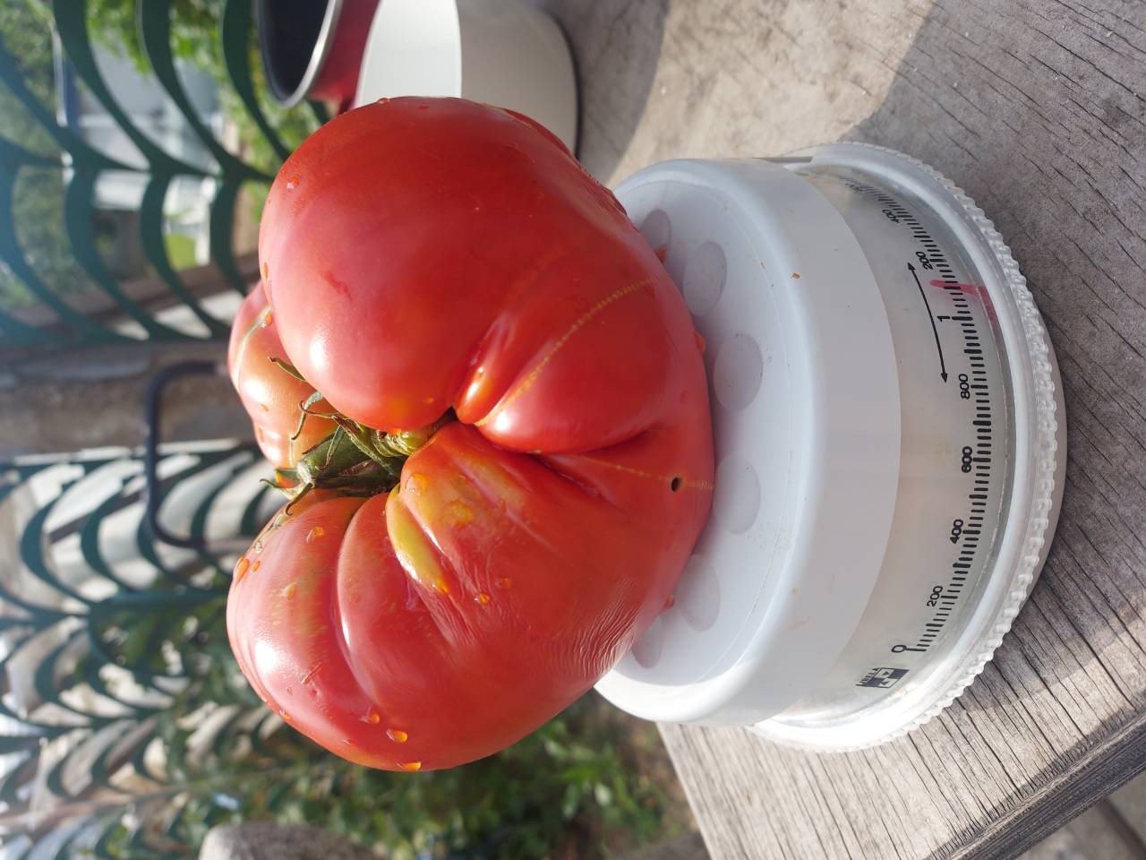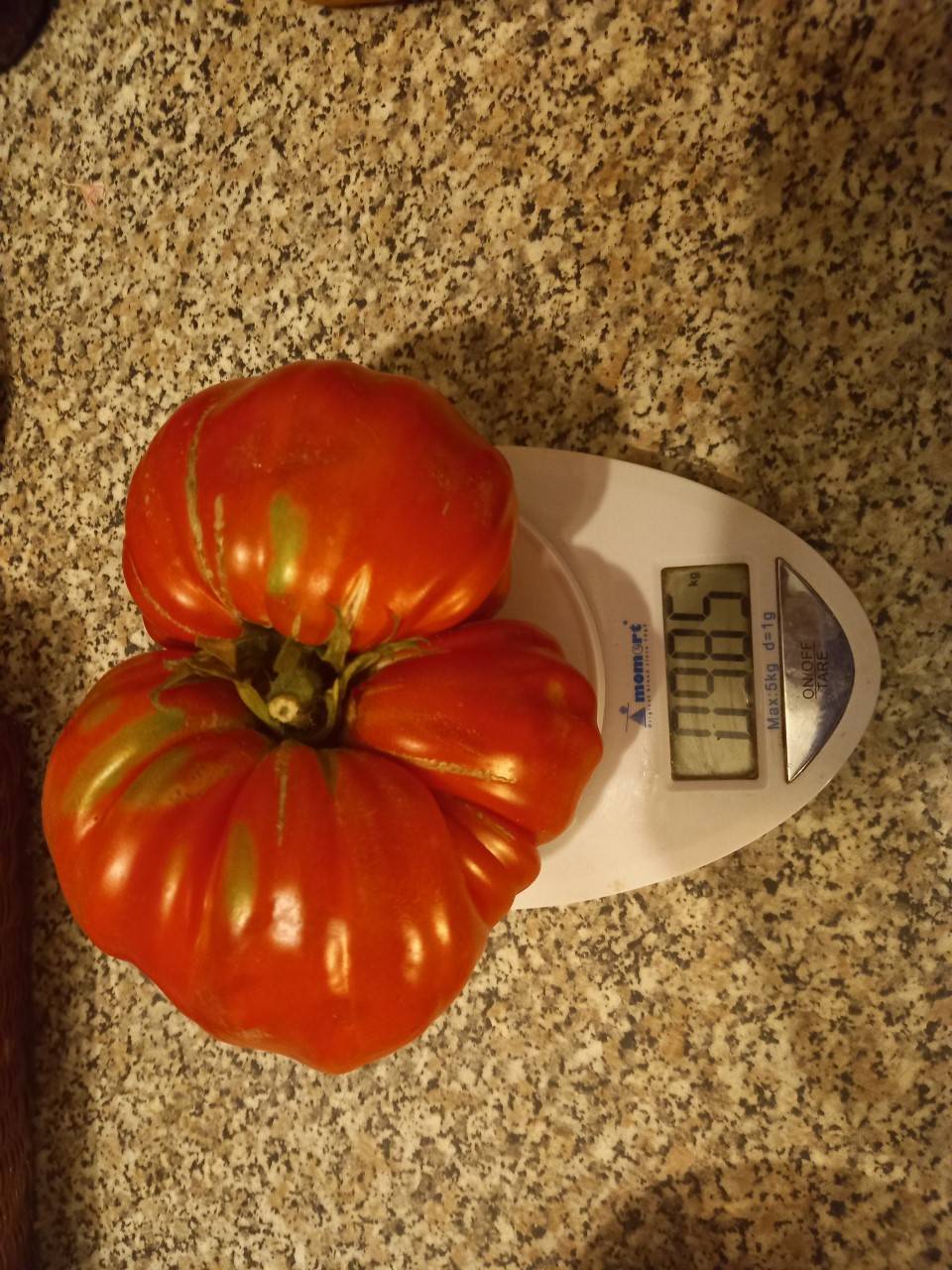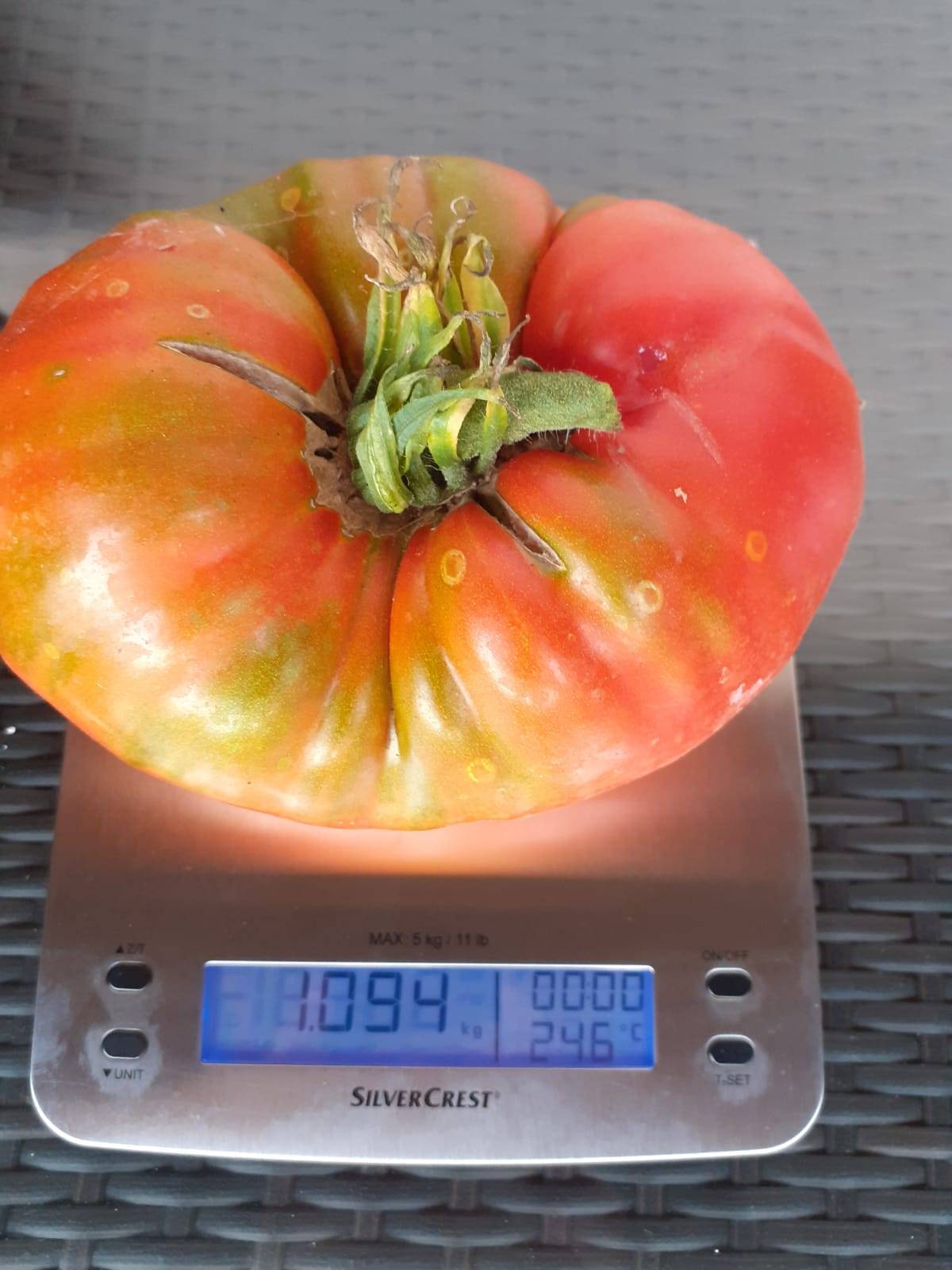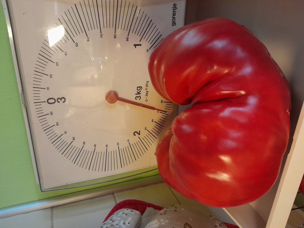 Paradižnik, ki ga lahko vidite na fotografiji, pa tehta 1100 gramov, kot vidite na razvidno na tehtnici.