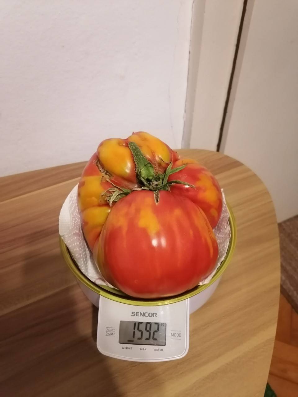 Irena Namestnik iz Laškega, je letos pridelala zelo velik paradižnik, ob fotografiji pa pripisala: »Na rastlini so rastli samo trije plodovi in samo eden je bil tako velik. Zalivamo iz vodnjaka pod vrtom, z dodatkom gnojila za paradižnik Plantela.«