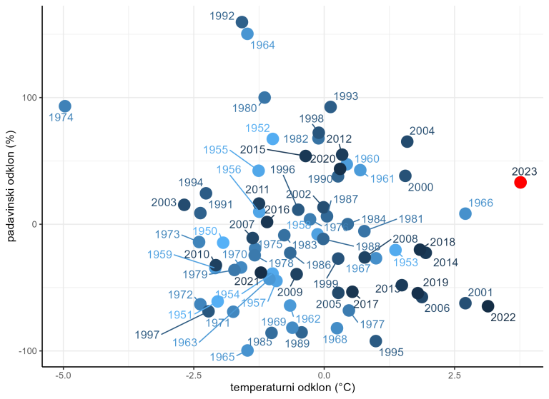 Oktober 2023 je po skupni mesečni statistiki zraka ter količine padavin najbolj podoben oktobru 1966, ki pa je bil na nivoju Slovenije za stopinjo Celzija manj topel ter povprečno namočen.