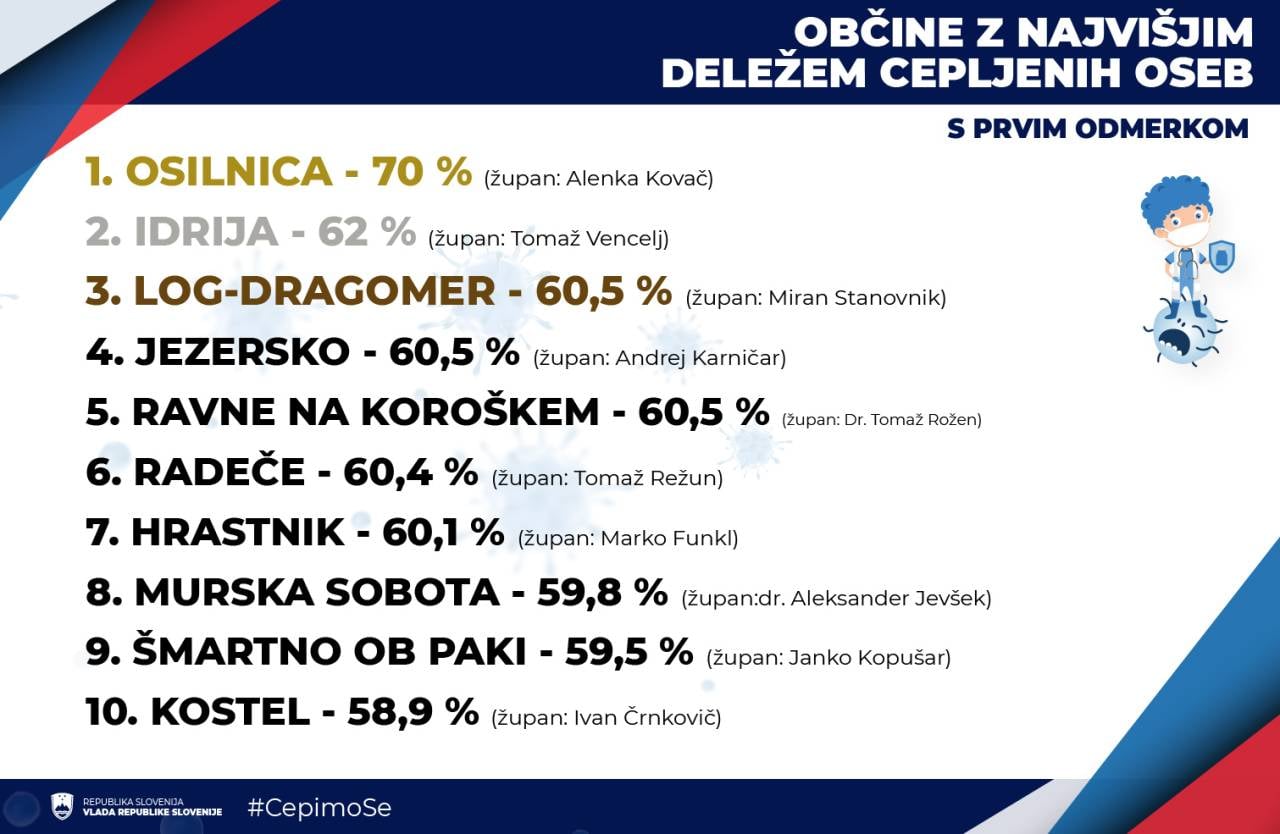 Največ cepljenih je v občini Osilnica, kjer je vsaj z enim odmerkom cepljenih že 70 odstotkov prebivalcev. 62 odstotkov jih je cepljenih v Idriji, 60,5 pa v občinah Log – Dragomer, Jezersko in Ravne na Koroškem.