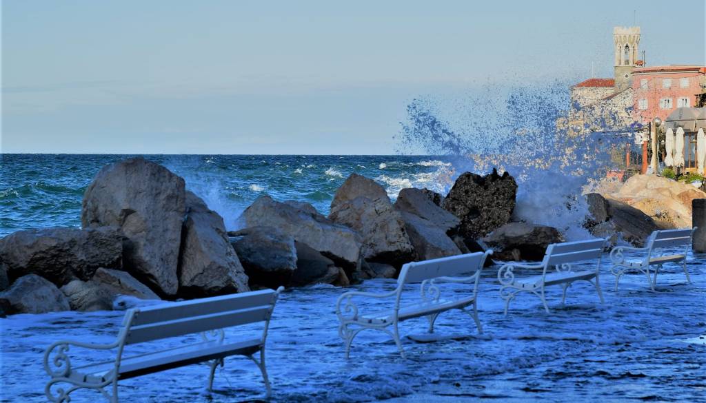 Morje je poplavilo Prešernovo in Kidričevo nabrežje, Punto ter predel ob Gea Collegu.
