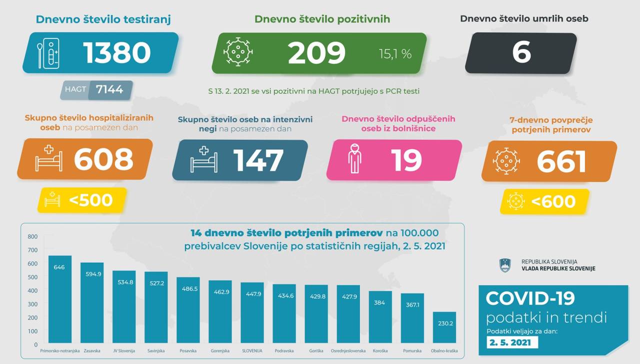 V Sloveniji so včeraj, 2. maja, opravili 1380 PCR testiranj na koronavirus in potrdili 209 novih okužb, gre za 15,1-odstotni delež okužb. Aktivnih primerov je po podatkih Covid-19 Sledilnika trenutno 9503.