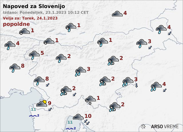 Drugod bo oblačno, občasno bodo še padavine, ki bodo pogostejše popoldne in zvečer. Po nižinah bo povečini deževalo. Najvišje dnevne temperature bodo od 1 do 4, na Goriškem in ob morju do 10 stopinj Celzija.