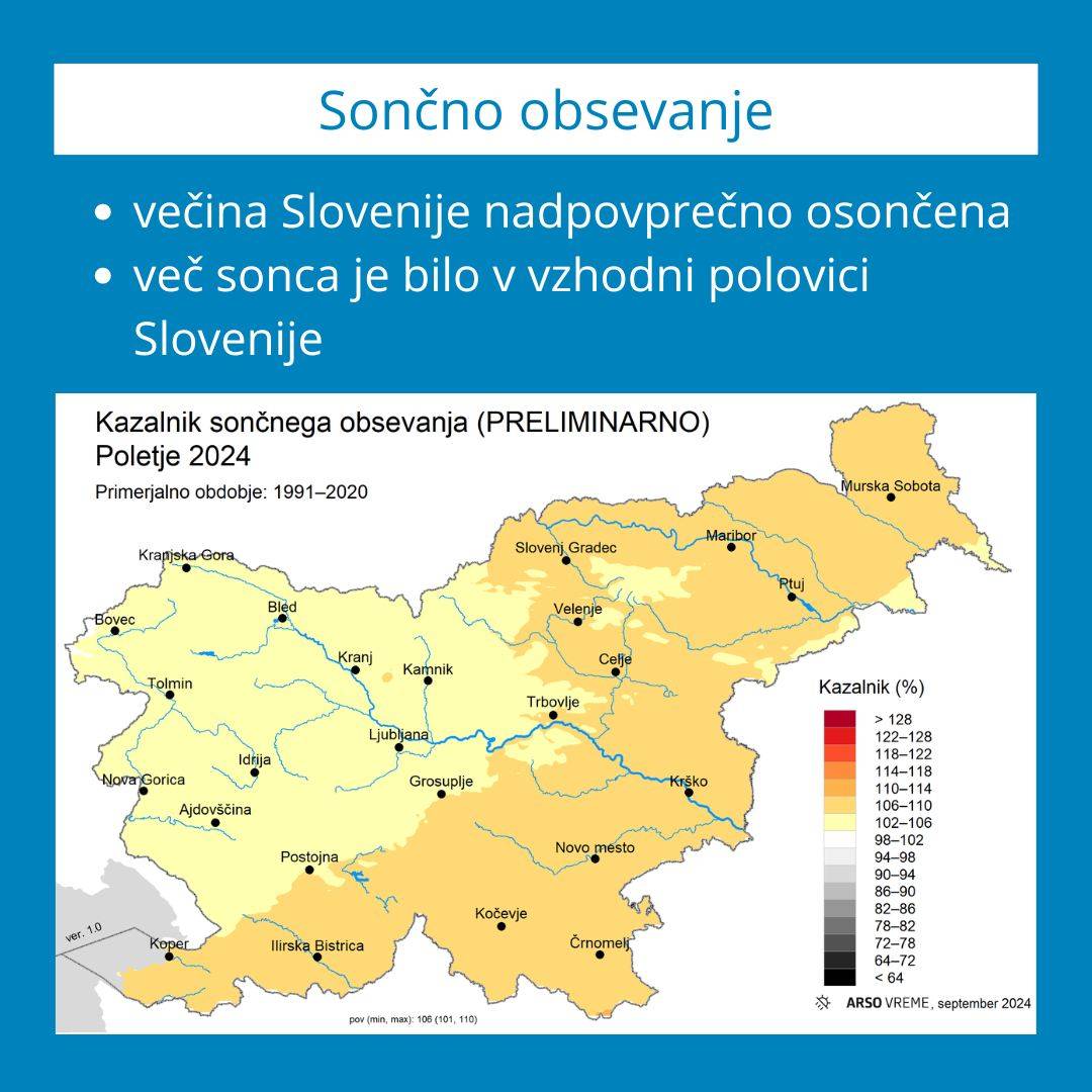 Poleg visokih temperatur in suše je bilo letošnje poletje tudi nadpovprečno osončeno. Osončenost je bila glede na obdobje 1991–2020 večja za kar 106 odstotkov, kar pomeni, da je bilo poletje 2024 deseto najbolj osončeno od leta 1961.