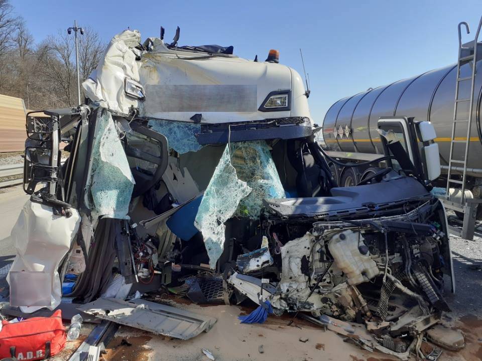 47-letni voznik tovornega vozila je zaradi vožnje z neprilagojeno hitrostjo trčil v zadnji del drugega tovornega vozila pred njim. Povzročitelj je vozil tovorno vozilo za prevoz nevarnega tovora, vendar kljub močno poškodovani kabini vozila do izpusta nevarne snovi ni prišlo. V nesreči se je povzročitelj lažje poškodoval, izdan mu je bil plačilni nalog.