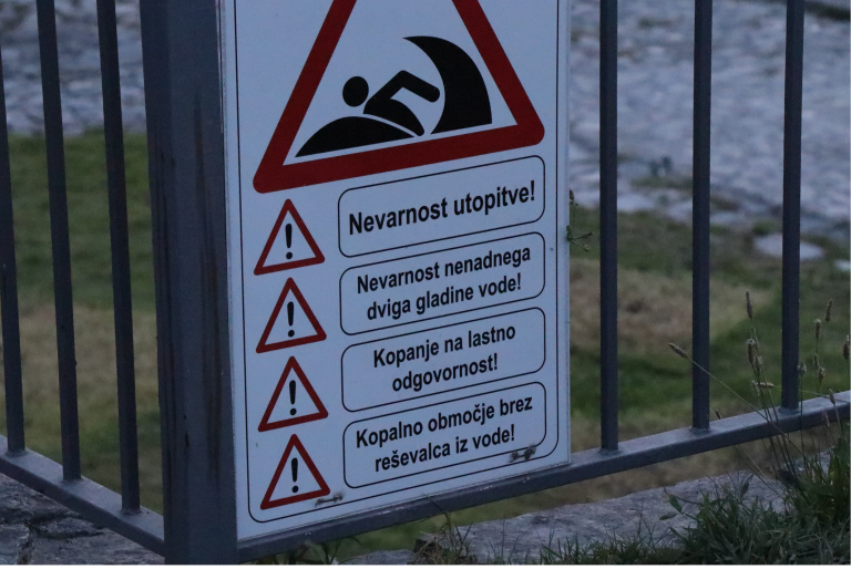 Opravljen je bil ogled kraja, pri katerem se je ugotavljalo tudi ali so vstopna mesta v reko Sočo označena z opozorilnimi tablami oz. je tam uradno kopališče. Pri ogledu je bilo ugotovljeno, da se na območju kajakaškega centra nahaja Kopalno območje Soča pri Solkanu. V tem delu območja pa je plaval otrok, ko ga je odnesel rečni tok. Na celotnem kopalnem območju je postavljenih več opozorilnih tabel z napisi: Nevarnost utopitve; Nevarnost nenadnega dviga gladine vode; Kopanje na lastno odgovornost in Kopalno območje brez reševalca iz vode; Na kopalnem območju se lahko zaradi uravnavanja pretokov hidroelektrarn pojavijo nenadni dvigi gladine in močni tokovi reke Soče, zato je potrebna dodatna previdnost kopalcev.