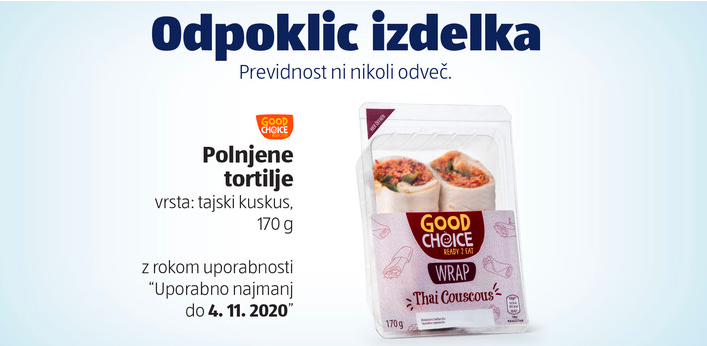 Drugi odpoklicani izdelek so polnjene tortilije vrste tajski kuskus, znamke GOOD CHOICE, ki ga dobavlja podjetje Wojnar‘s Wiener Leckerb, z rokom uporabnosti najmanj do 4. novembra 2020. Pri tem izdelku je bila ugotovljena prisotnost listerije.