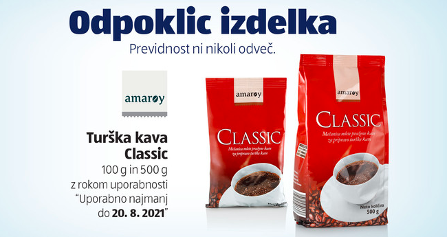 Na enem od rednih preverjanj kakovosti so pri omenjenih dveh izdelkih ugotovili nepravilnosti. Pri turški kavi Classic znamke Amaroy so bile pri 100 g in 500 g pakiranju, z rokom uporabnosti najmanj do 20. avgust 2021, ugotovljene presežene vrednosti ohratoksina A.