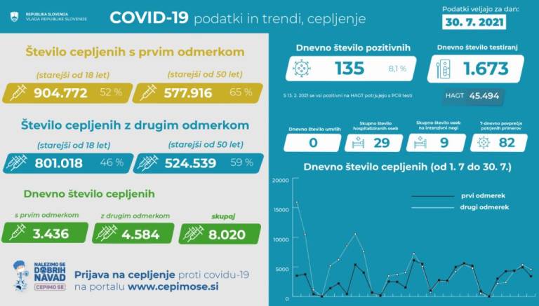 V Sloveniji so včeraj, 30. julija, opravili 1673 PCR testiranj na koronavirus in potrdili 135 novih okužb, gre za 8,1-odstotni delež okužb. Nazadnje so več okužb potrdili 9. junija, in sicer 195.