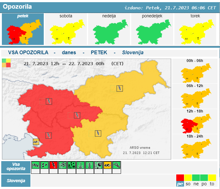 Za zahodno in osrednjo Slovenijo je med 14. in 18. uro izdano rdeče vremensko opozorilo, po napovedih Agencije Republike Slovenije za okolje se močan nevihtni sistem od zahoda bliža Sloveniji.