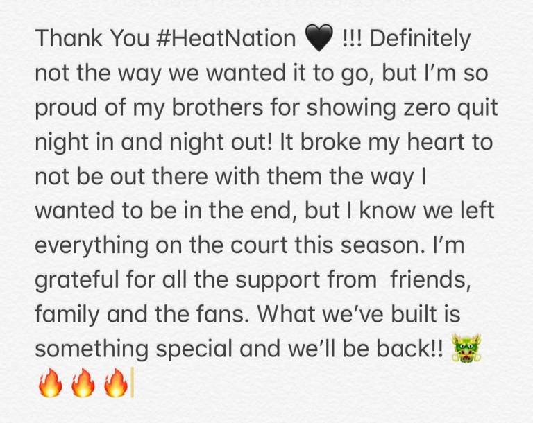 "Hvala HeatNation!!! Ni se sicer končalo, kot smo želeli, vendar sem zelo ponosen na svoje brate, ki se nobeno noč niso predali! Srce se mi je zlomilo, ker nisem mogel biti z njimi, kot sem želel na koncu. Vendar vem, da smo v tej sezoni pustili na parketu vse. Hvaležen sem za podporo svojih prijateljev, družine in navijačev. Kar smo zgradili, je nekaj posebnega. Vrnili se bomo."