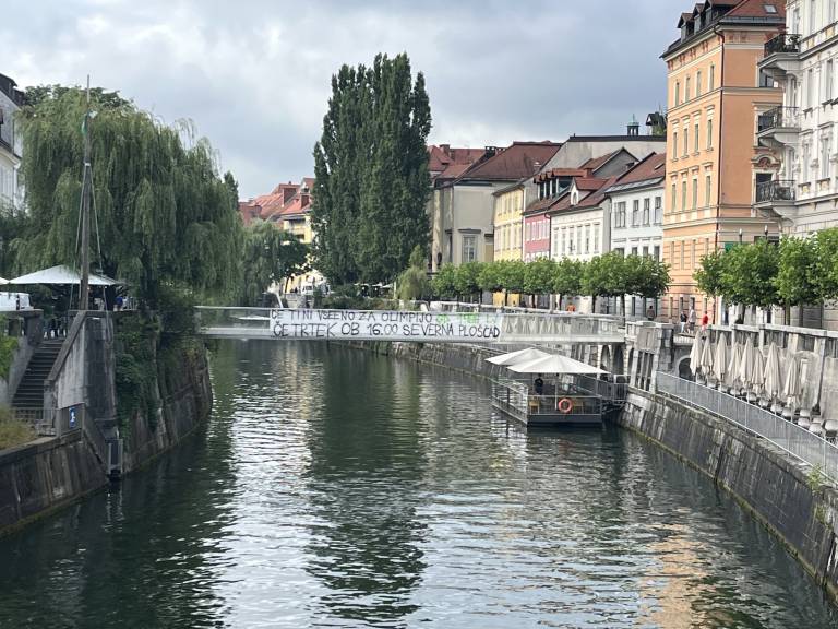 V luči dogajanja je Ljubljančane danes v središču mesta pričakal napis, ki ga je izobesila navijaška skupina Green Dragons. Pozvali so, naj se tisti, »ki jim ni vseeno za Olimpijo«, ob 16. uri zberejo na severni ploščadi, torej pred severno tribuno pred stadionom Stožice.