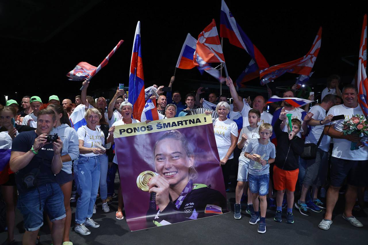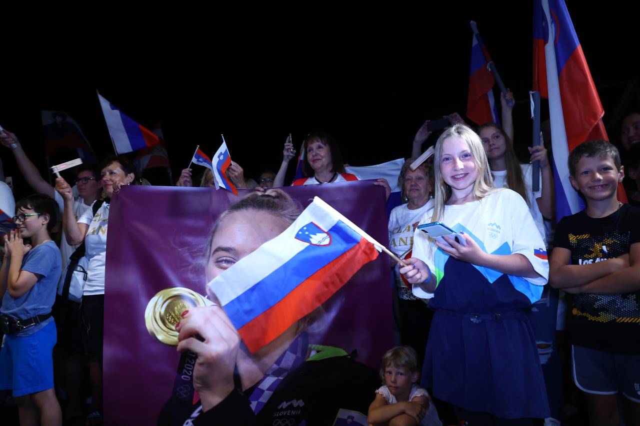 Kljub pozni uri je Janjo Garnbret, ki je na Olimpijskih igrah v Tokiu Sloveniji priborila zlato medaljo v plezanju, na brniškem letališču z navdušenjem sprejela manjša množica.