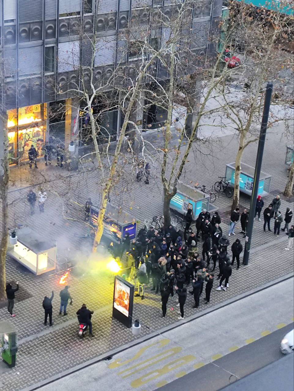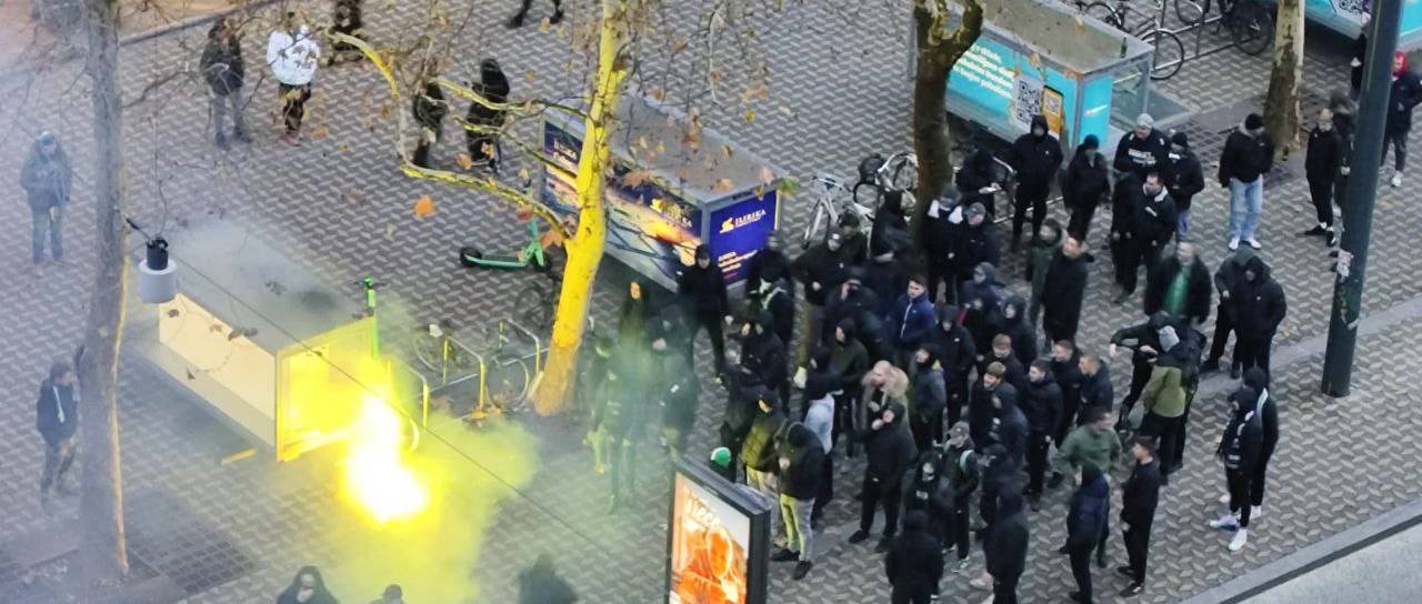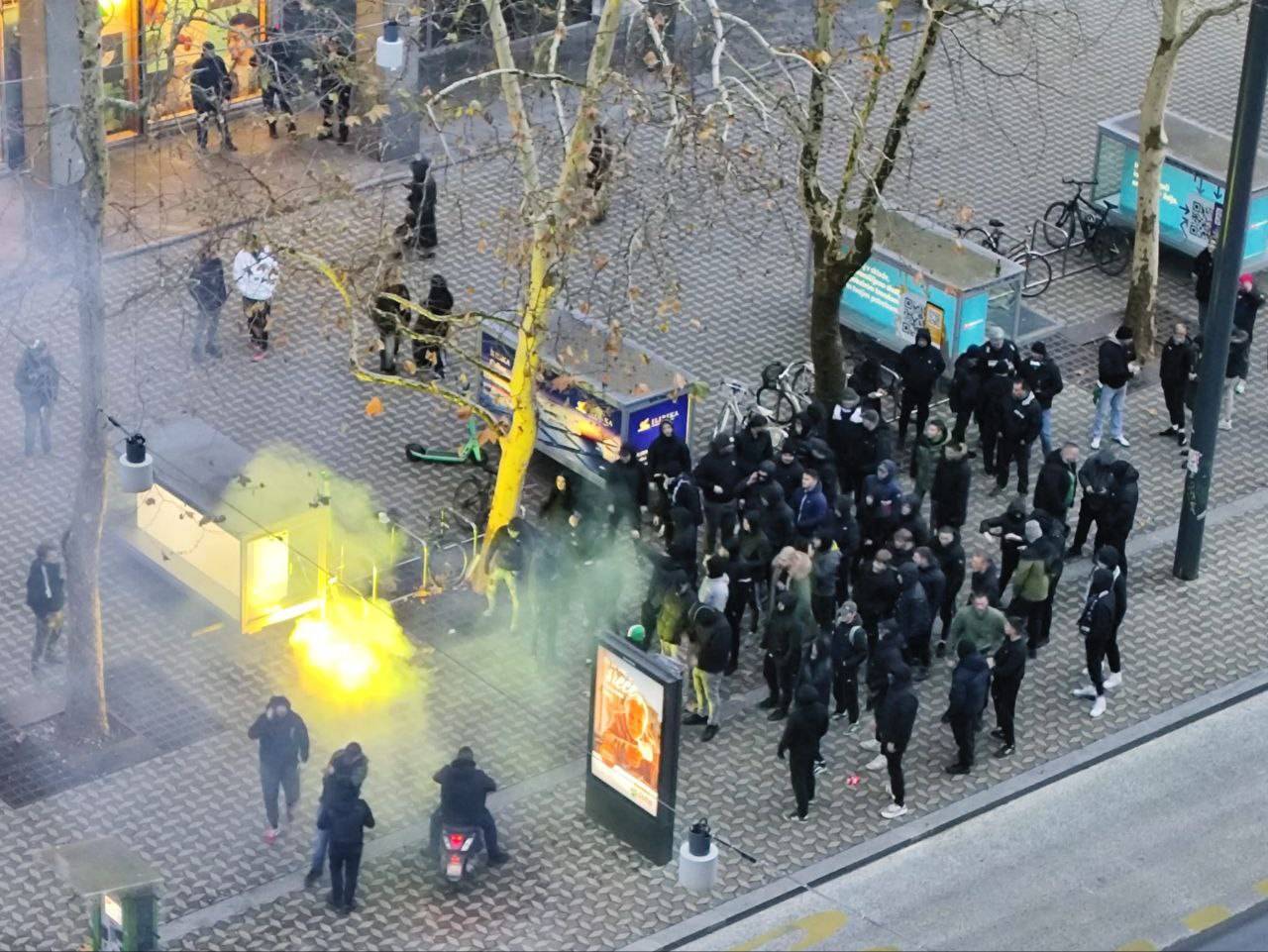 Navijači Olimpije se pred današnjim mestnim derbijem že zbirajo v središču Ljubljane. Na Bavarskem dvoru so nase opozorili z glasnim navijanjem in pirotehniko.