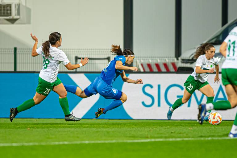 Nekaj minut v končnici prvega polčasa je pripadlo zmajčicam, Iva Kocijan pa je bila vselej na mestu. Prvič v 38. minuti, ko je po odvzeti žogo streljala Sara Makovec, tri minute zatem je poskus Anje Prša izbila v kot, po njem pa je zaustavila še strel Tatiane Georgiou.