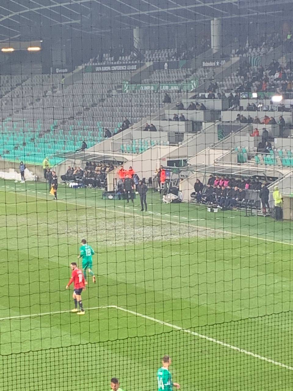 Zadnja tekma skupinskega dela UEFA Evropske konferenčne lige se je pričela v skorajda nemogočih razmerah. Del igrišča, ki je bližje zahodni tribuni, je povsem blaten in deloma tudi pod vodo, zato so morali organizatorji tekme težave reševati na precej nenavaden način.