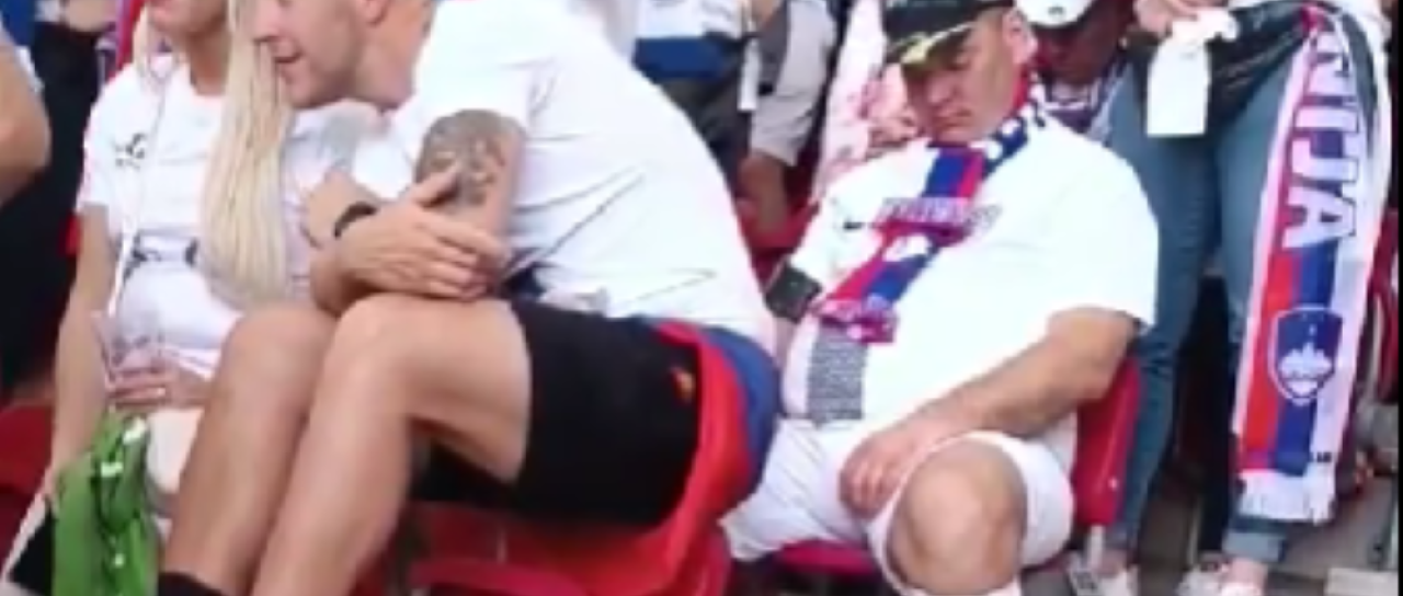 Za tega navijača je bila naporna že pot v Nemčijo. Komentatorji se šalijo, da je drago plačal za karto, zdaj pa spi na tekmi.