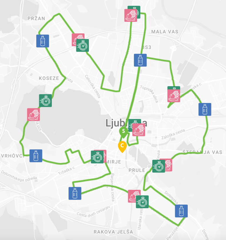 Start maratona je na Slovenski cesti v središču mesta. Tekači naredijo en krog skozi mesto: najprej se odpravijo na sever proti Bežigradu, nato obiščejo Šiško in Koseze ter zaobidejo Rožnik.
