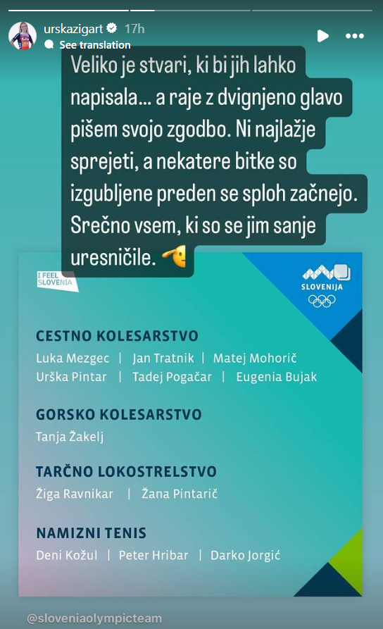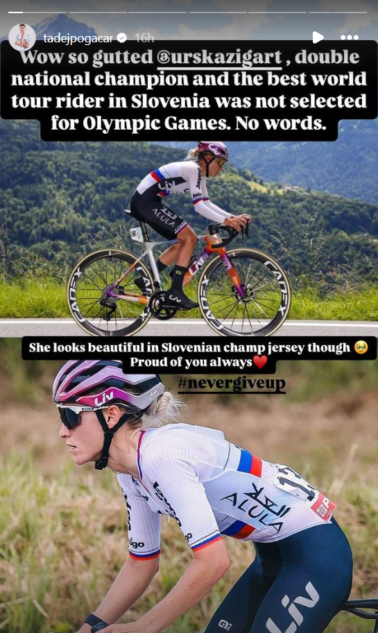 Žalostno je, da Urška Žigart, dvakratna državna prvakinja in najboljša slovenska kolesarka na svetovni turneji, ni bila izbrana za olimpijske igre. Brez besed sem,« pa je na Instagramu ob njeni fotografiji zapisal Pogačar.