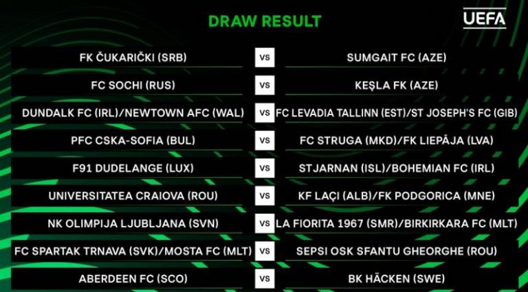 Olimpija je na današnjem žrebu dobila tudi tekmeca, s katerim bo igrala v drugem krogu kvalifikacij za konferenčno ligo. Za napredovanje v tretji krog se bo pomerila z zmagovalcem dvoboja med La Fiorito iz San Marina in Birkirkaro iz Malte. Prvo tekmo bodo Ljubljančani odigrali v Stožicah 22. julija, povratno pa v gosteh 29. julija.