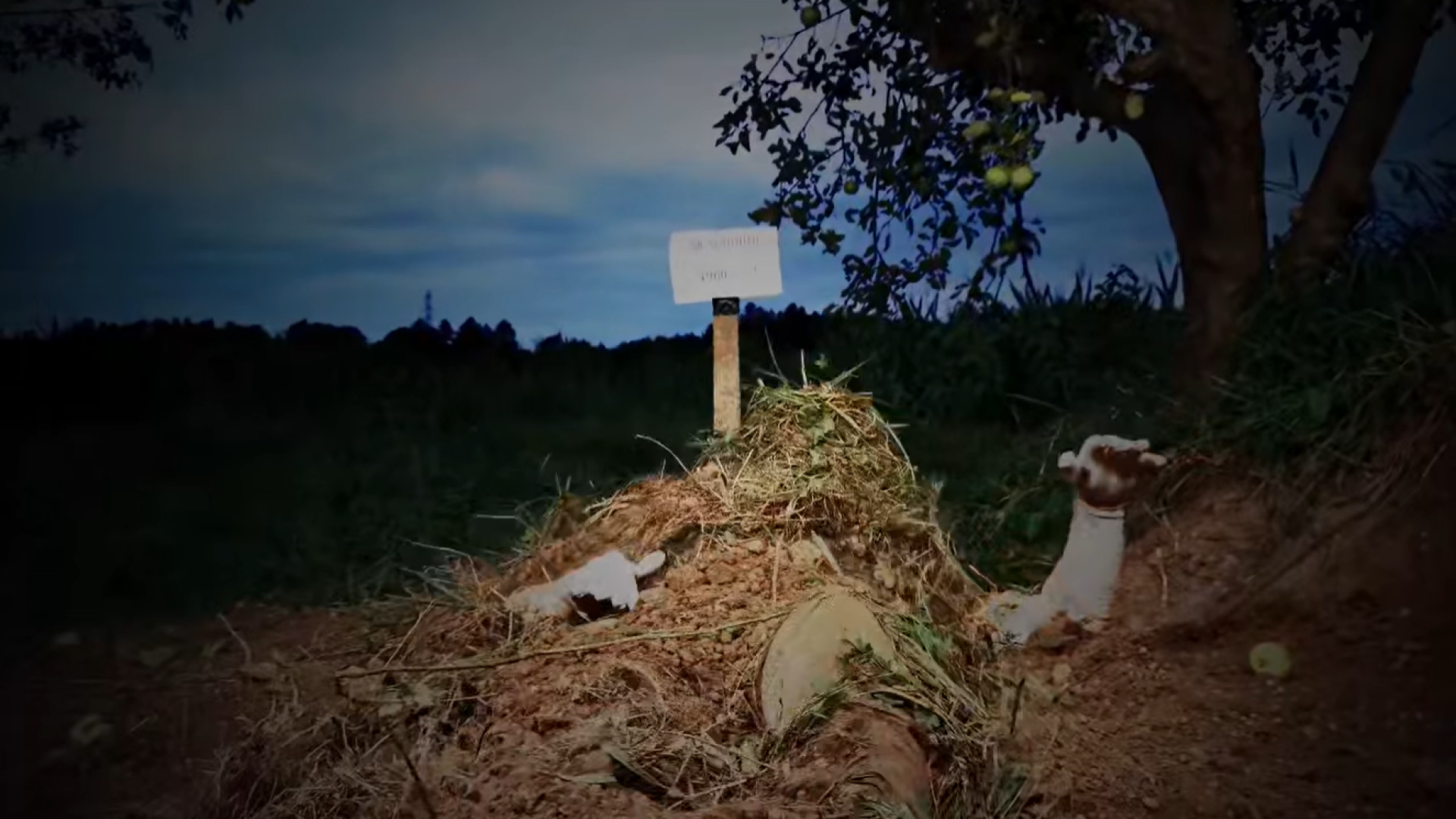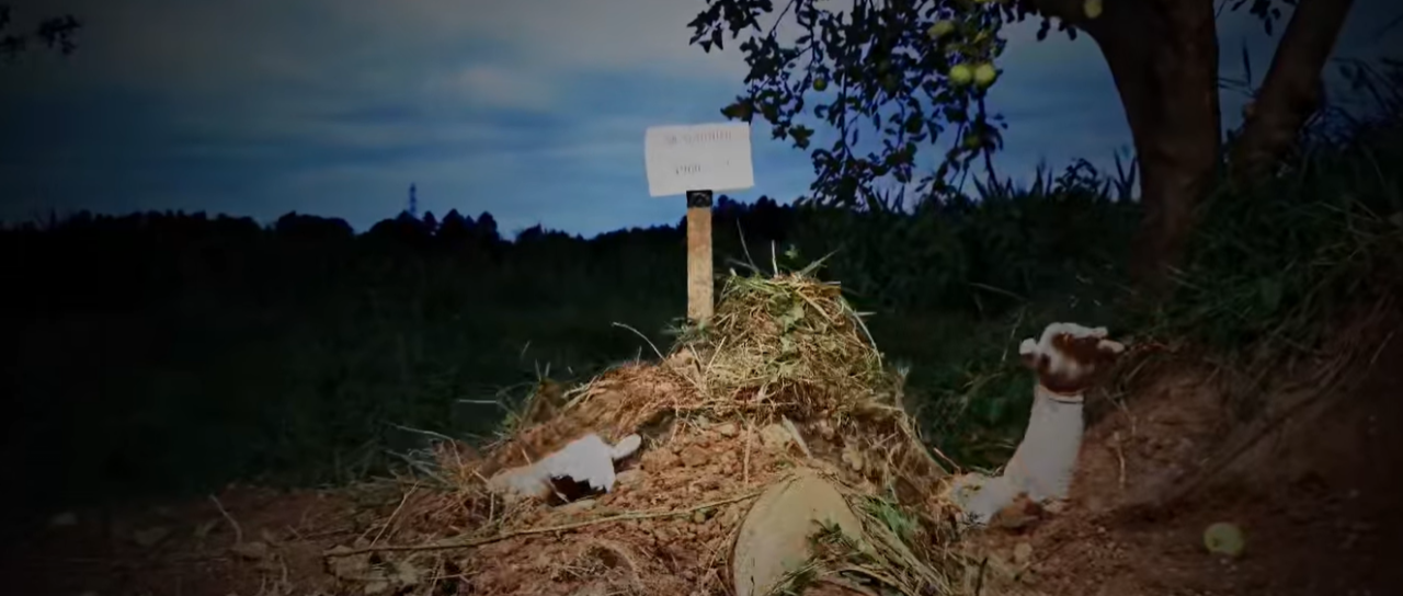 Smučarja so z masko na glavi zakopali kar v ... grob. Pri kopanju je pomagal celo bager. A situacija se hitro obrne. Športniku se uspe rešiti in ... zagristi v zeleno jabolko, simbolično jabolko zmage.