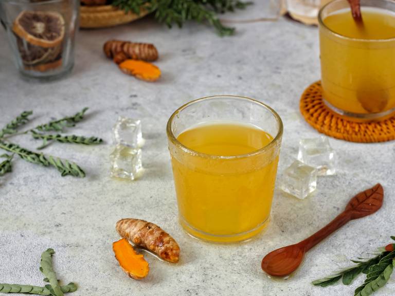 V kozarec tople vode dodamo žličko kurkume v prahu, sok pol limone in po želji malo medu. Dobro premešamo in popijemo zjutraj ali pred spanjem.