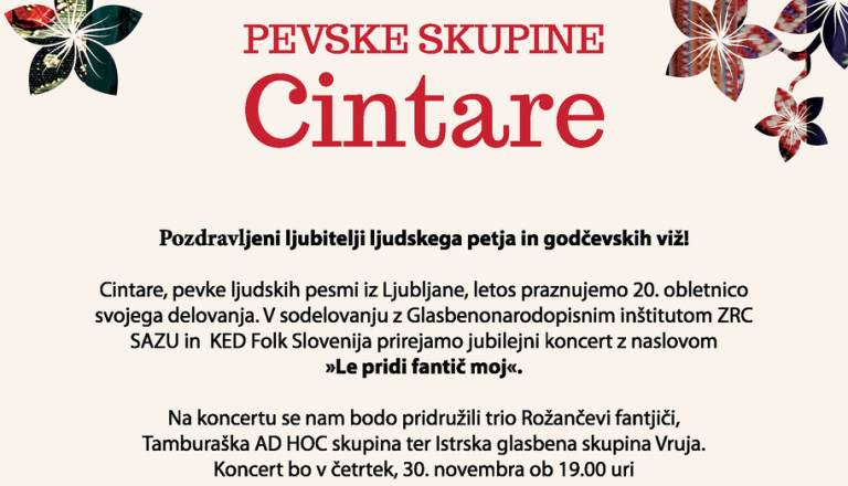 Vabljeni na koncert pevske skupine Cintare, ki poustvarja slovenske ljudske pesmi. Na koncertu se bodo pevkam pridružil vidnejši poustvarjalci in poustvarjalke ...