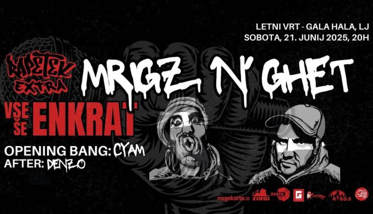 🎤 RAPETEK EXTRA: MRIGZ & GHET (SI) 🎤 Mrigz & Ghet Vse - Še - ENKRAT z gosti Opening: CYAM After: DENZO (Ams) Domača ambasadorja street kulture, Mrigo in Ghet ...