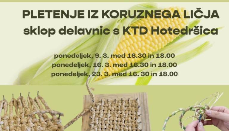 V treh marčevskih ponedeljkih bomo pletli podstavek iz koruznega ličja! V ponedeljek, 9. 3., 16. 3. in 23. 3. med 16.30 in 18.00 v Hiši Sadeži družbe Logatec ...