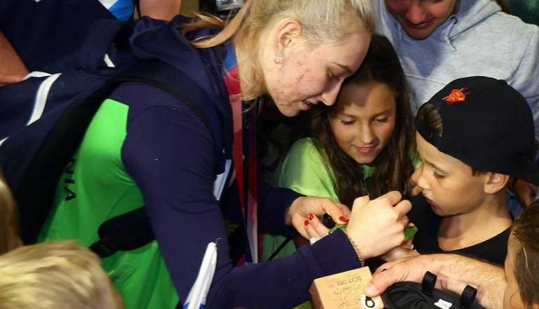 FOTO: Janja Garnbret prispela na brniško letališče, pričakala jo je navdušena množica