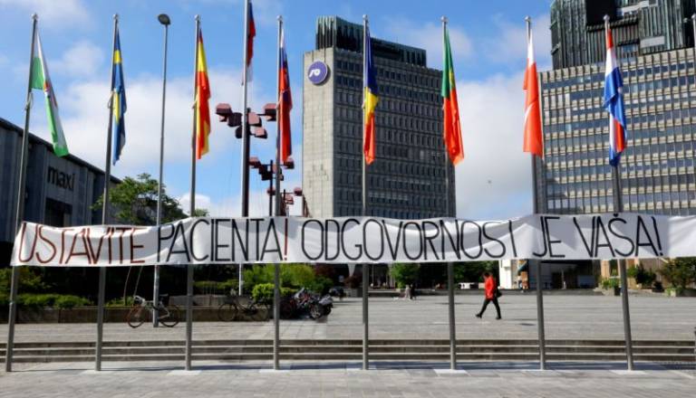 Na drogovih za zastave pred parlamentom napis Ustavite pacienta! Odgovornost je vaša!